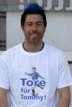 FSV Frankfurt vs SV Viktoria Aschaffenburg, Markus Gaubatz mit blauen Haaren und T-Shirt "Tore f?r Tommy"