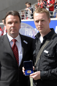 Saison 2006/07 Eintracht Frankfurt vs VFL Bochum, Heribert Bruchhagen und Christoph Preu? mit seiner Medaille Tor des Monats