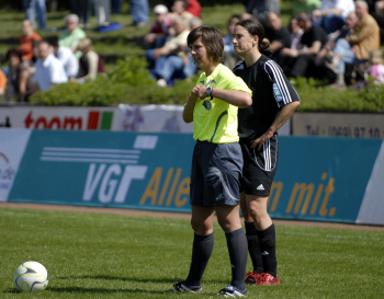 1. FFC Frankfurt vs FC Freiburg, Birgit Prinz und Schiedsrichterin Christiane Sch?nefeld