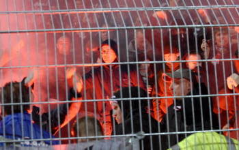 Pokal-Viertelfinale, Offenbacher Kickers vs Eintracht Frankfurt, Fans hinter Gittern im Bengalolicht