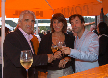 8. Bild-Metropress-Cup in Friedberg, Golfpark am L?wenhof, Apfelweinqueen Johanna H?hl mit Trainer J?rg Berger und Schauspieler Jan Josef Liefers