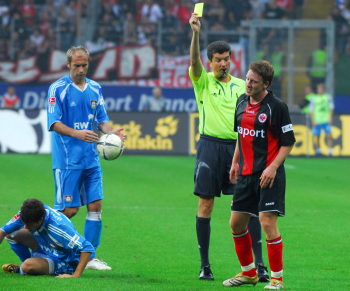 Eintracht Frankfurt vs Bayer Leverkusen, Schiri Fandel gibt Patrick Ochs die gelbe Karte