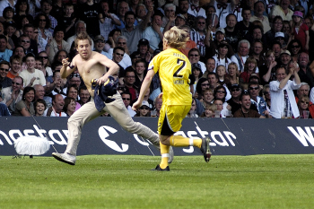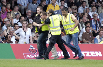FC St. Pauli vs. Alemannia Aachen, Ein Flitzer auf dem Spielfeld wird von Sicherheitleuten entfernt