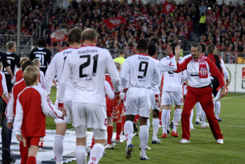 Mainz 05 vs FC Augsburg, Stadionsprecher klatscht alle Spieler beim Einlaufen ab
