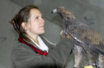 Eintracht Frankfurt vs Hannover 96, Auge in Auge, Eintracht-Maskottchen Attila mit seiner Falknerin