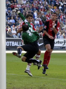 Eintracht Frankfurt vs Bayer 04 Leverkusen, Aleksandar Vasoski mit dem Torwart der 03 Neu-Isenburg