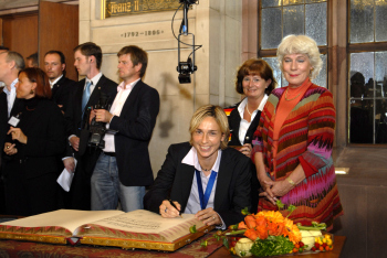 Ehrung der Weltmeisterinnen im Frankfurter R?mer. eintrag ins goldene Buch