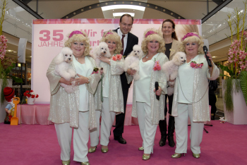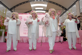 B?rgermeister Oliver Quilling mit den Jacob Sisters, die f?r Sitmmung im Isenburg Zentrum sorgen