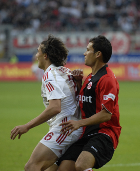 Eintracht Frankfurt vs Bayer 04 Leverkusen, Simon Rolfes wird gedeckt von Aaaron Galindo