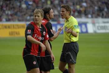 Eintracht Frankfurt vs Bayer 04 Leverkusen, Ioannis Amanatidis diskutiert heftig mit Schiedsrichter Dr. Felix Brych