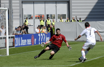 Mainz 05 vs TuS Koblenz Torwart Dennis Eilhoff geschlagen, Markus Feulner jubelt