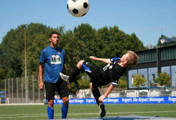 1.8.2007 FSV Frankfurt, FFH Fussballschule Azis Bouhaddouz zeigt die richtige Haltung beim Fallr?ckzieher
