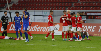 08.08..2025 xhpx Offenbach am Main, Sparda-Bank-Hessen Stadion - Stadion Bieberer Berg Kickers Offenbach (OFC) - FC Bayern Alzenau Jubel über den Sieg, Frust ua. bei Marcel Wilke (Alzenau) ********* Foto: A2Bildagentur Peter Hartenfelser