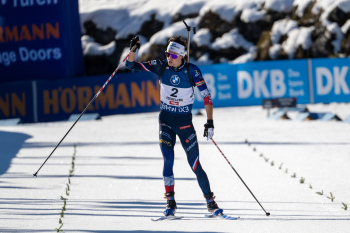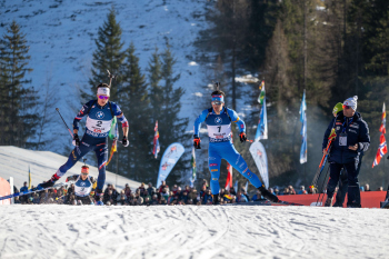 Jubel und Freude bei den Siegern v.l. Tommaso Giacomel (ITA), Eric Perrot (FRA) und Johan-Olav Botn (NOR).