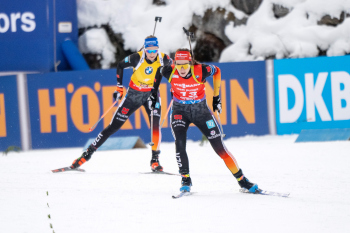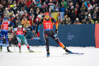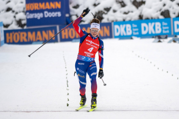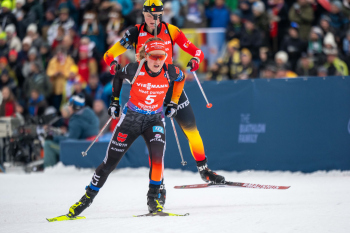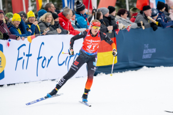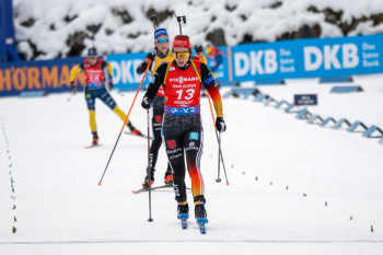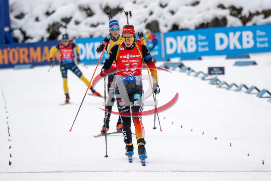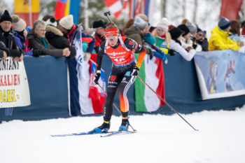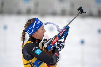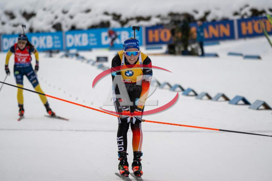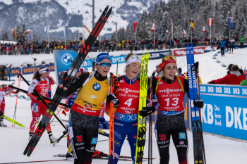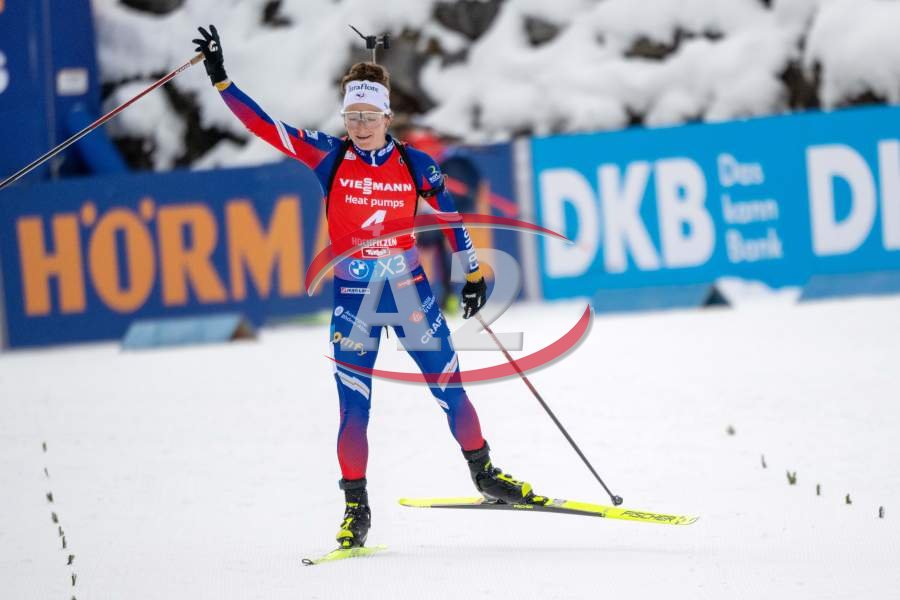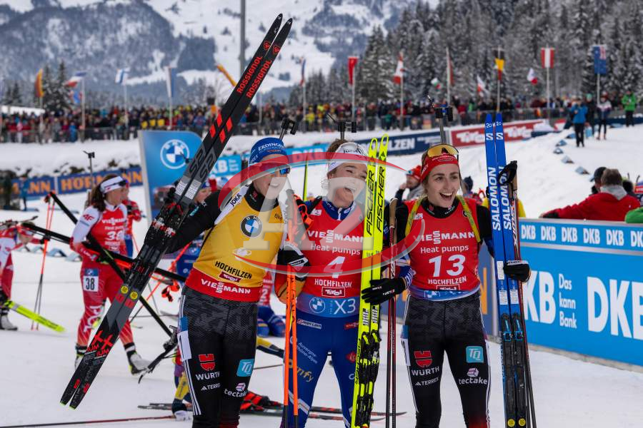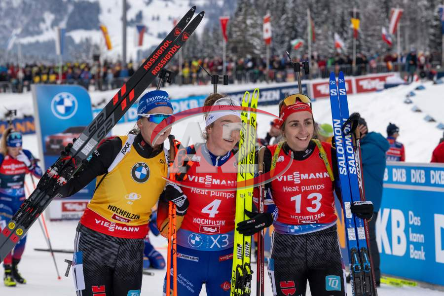 Die drei auf dem Stockerl, v.l. 3th Platz Franziska Preuss (GER), Siegerin Lou Jeanmonnot (FRA) und 2th Platz Vanessa Voigt (GER).