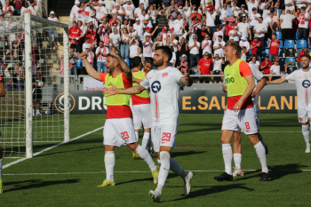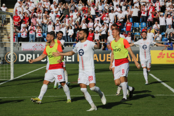 Keanu Staude (29, OFC) bringt den OFC durch sein Tor zum 2:1 in Führung - Torjubel hier mit Maik Vetter (8, OFC)