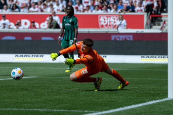 Jubel und Freude nach dem Schlusspfiff bei den Stuttgarter Spielern, v.l. Wooyeong Jeong, Silas Katompa Mvumpa, Enzo Millot, Genki Haraguchi, Maskottchen Fritzle, Chris Führich, Torwart Florian Schock, Jamie Leweling, Pascal Stenzel und Anthony Rouault (VfB Stuttgart).