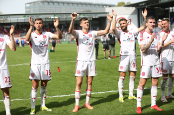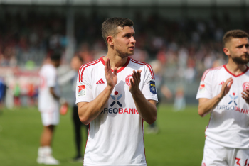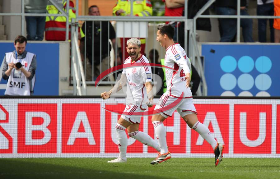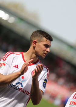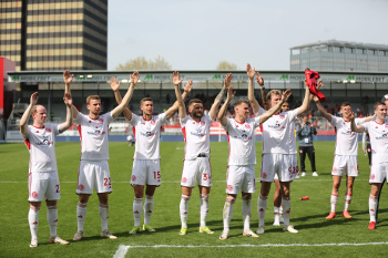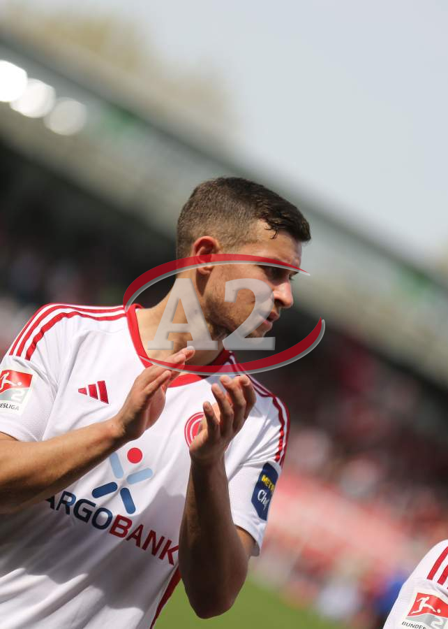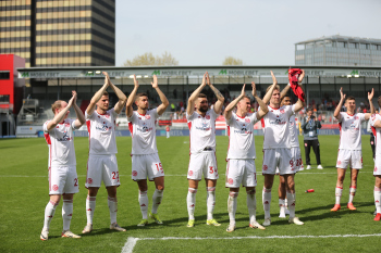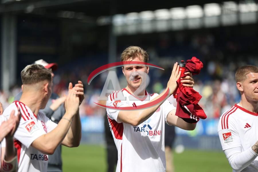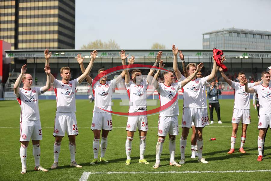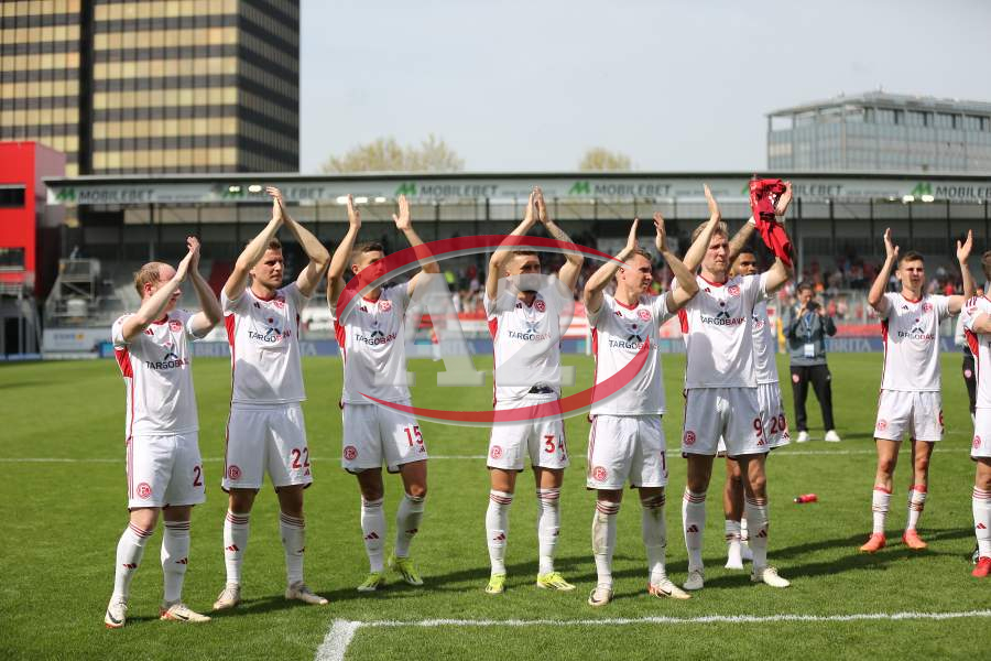 13.04.2024, xcex, GER, Wiesbaden, BRITA-Arena, Fussball, 2. Bundesliga, Saison 2023/2024, Spieltag 29, SVWW, Spieler feiern mit Fans, Mannschaft feiert Sieg, Jubel, Freude, Emotionen, celebration, Yannik Engelhardt (F95)
