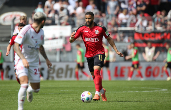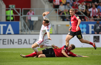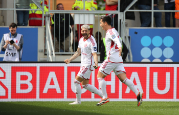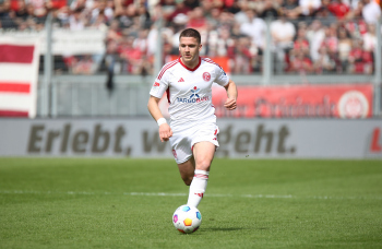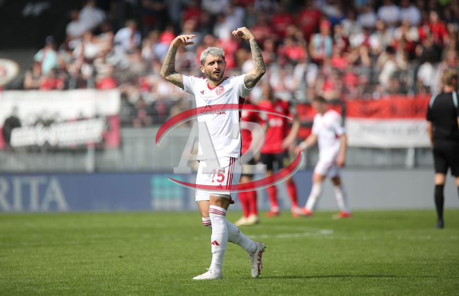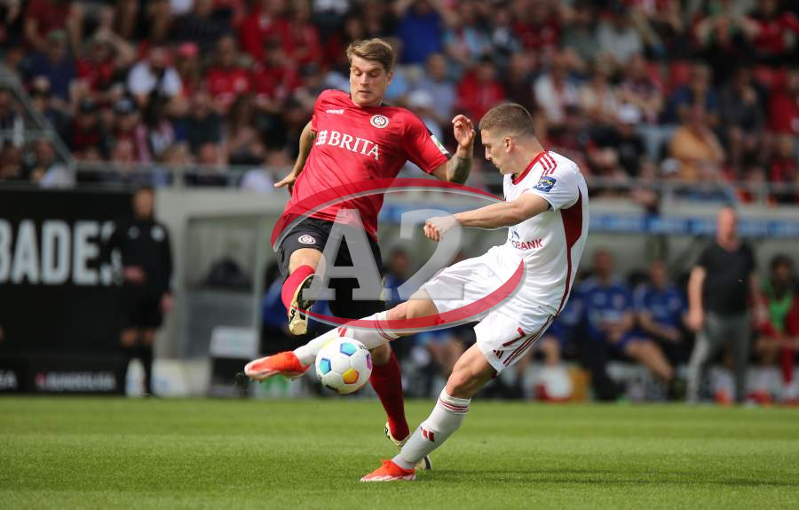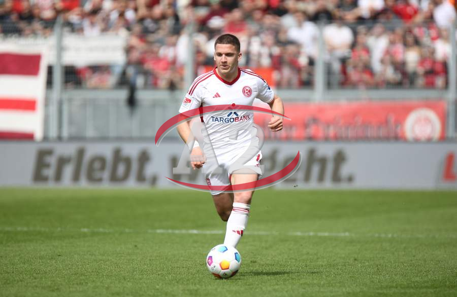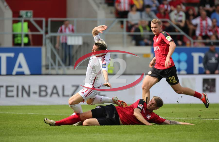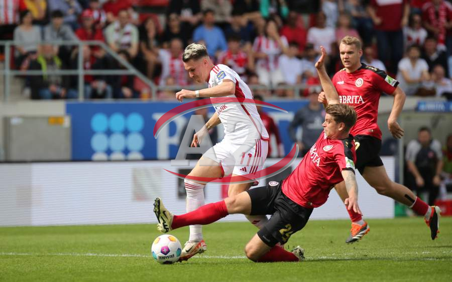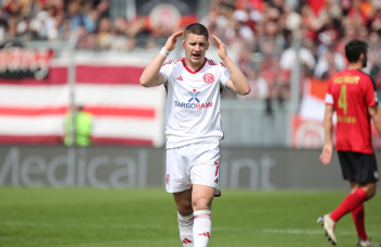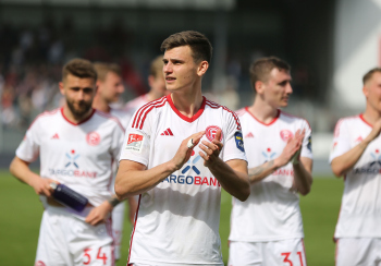 13.04.2024, xcex, GER, Wiesbaden, BRITA-Arena, Fussball, 2. Bundesliga, Saison 2023/2024, Spieltag 29, SVWW, Spieler feiern mit Fans, Mannschaft feiert Sieg, Jubel, Freude, Emotionen, celebration, Yannik Engelhardt (F95)