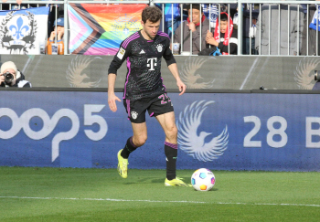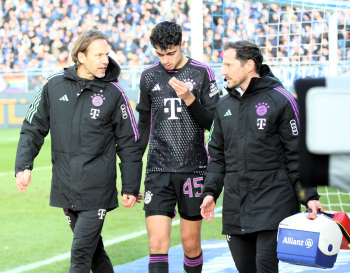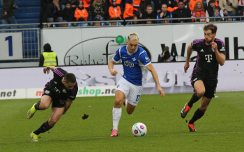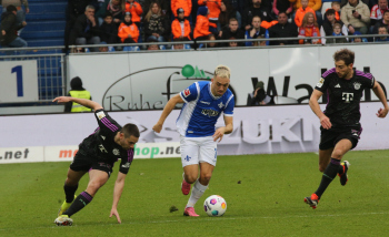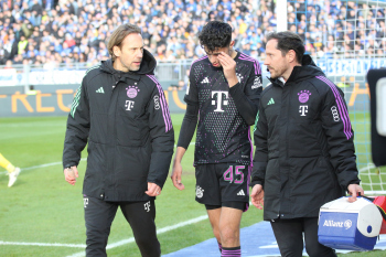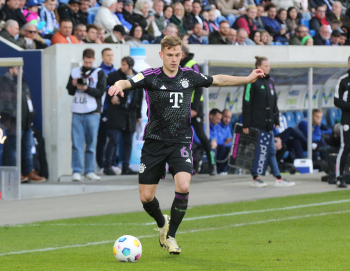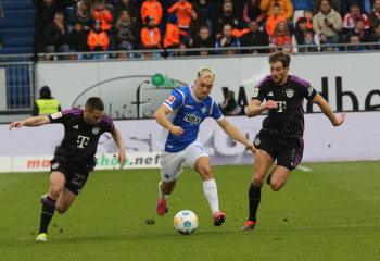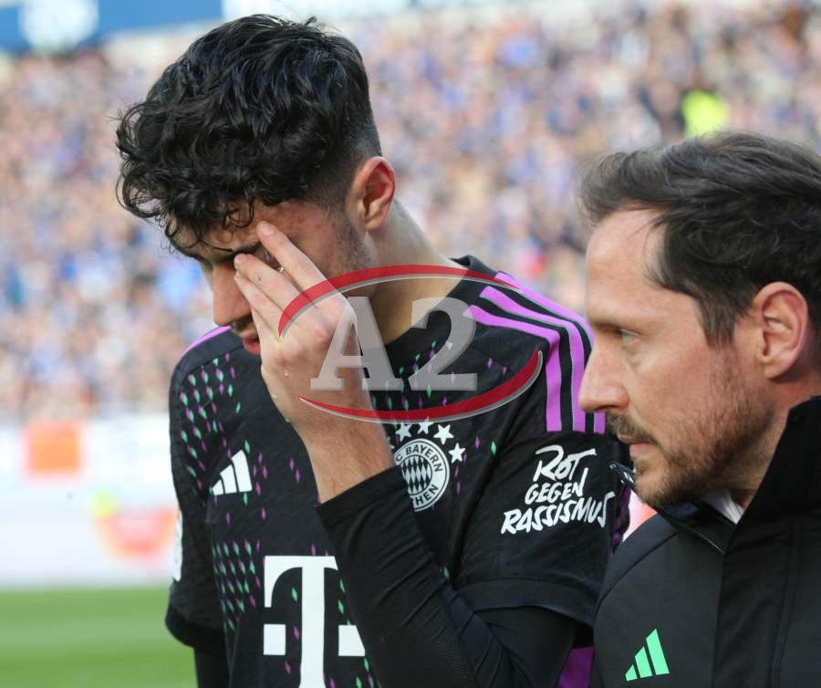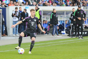 Jamal Musiala und Leroy Sané (FC Bayern München) gegen Tobias Kempe (11, SV98), Tim Skarke (27, SV98), Mathias Honsak (18, SV98)
